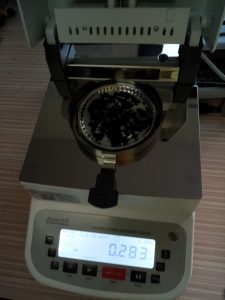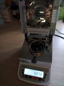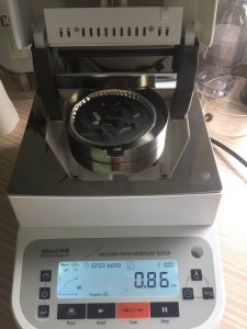3、平衡后將樣品瓶移出,取出樣品,用電子天平稱取樣品置于樣品瓶內(nèi),然后在水分儀上點(diǎn)擊開始測量,同時將樣品瓶裝入加熱槽。