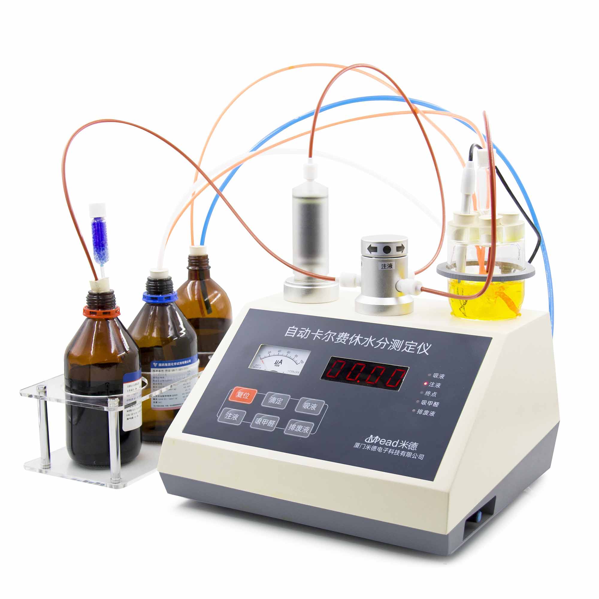 MDZY-RLJ1型自動快速卡爾費休水分測定儀是采用卡爾費休容量滴定法測定水分含量的自動分析儀器。MDZY-RLJ1經(jīng)濟型容量法卡爾費休水分儀依據(jù)經(jīng)典的卡爾費休容量滴定原理設(shè)計,機械結(jié)構(gòu)采用先進的精密計量泵和耐腐蝕三通閥,整個液路都選用特殊材料制成,耐腐性能極佳,可保證長期穩(wěn)定工作,是生產(chǎn)和科研工作理想的水分檢測儀器。